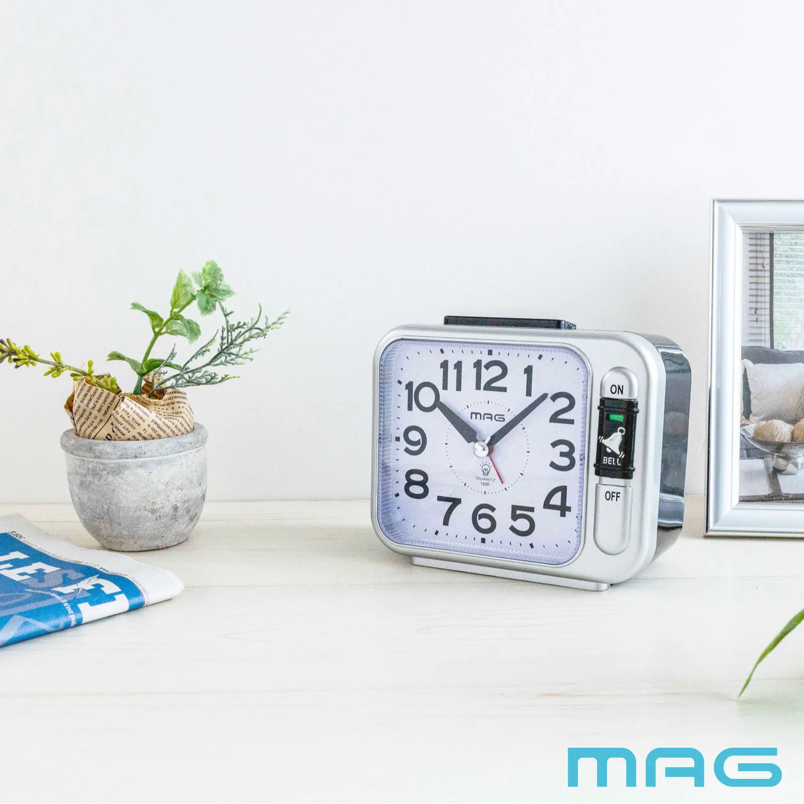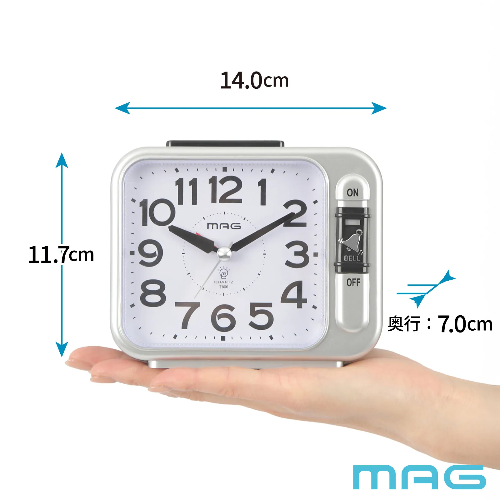 定番フォルムの目覚まし時計。よく触れるアラームON/OFFスイッチは使い勝手を考慮し前面に配置。アラーム音は力強いベル音で起床できます。秒針はスムーズに動きます。