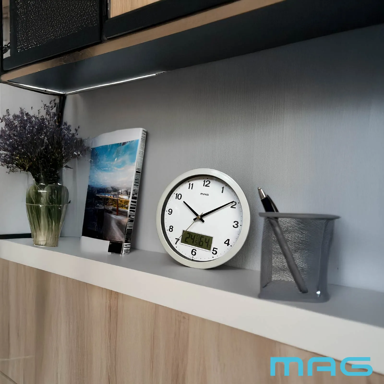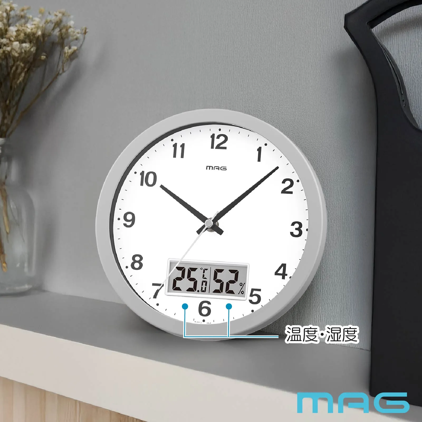 インテリアに合わせやすいマットカラー。いつでも見やすい場所に設置しつつ、温度・湿度表示付きでお部屋の快適具合も把握できます。