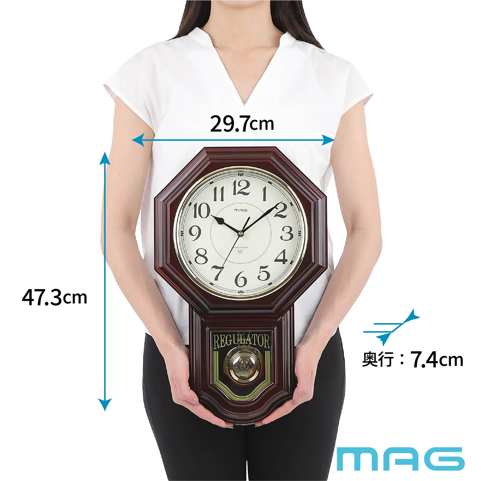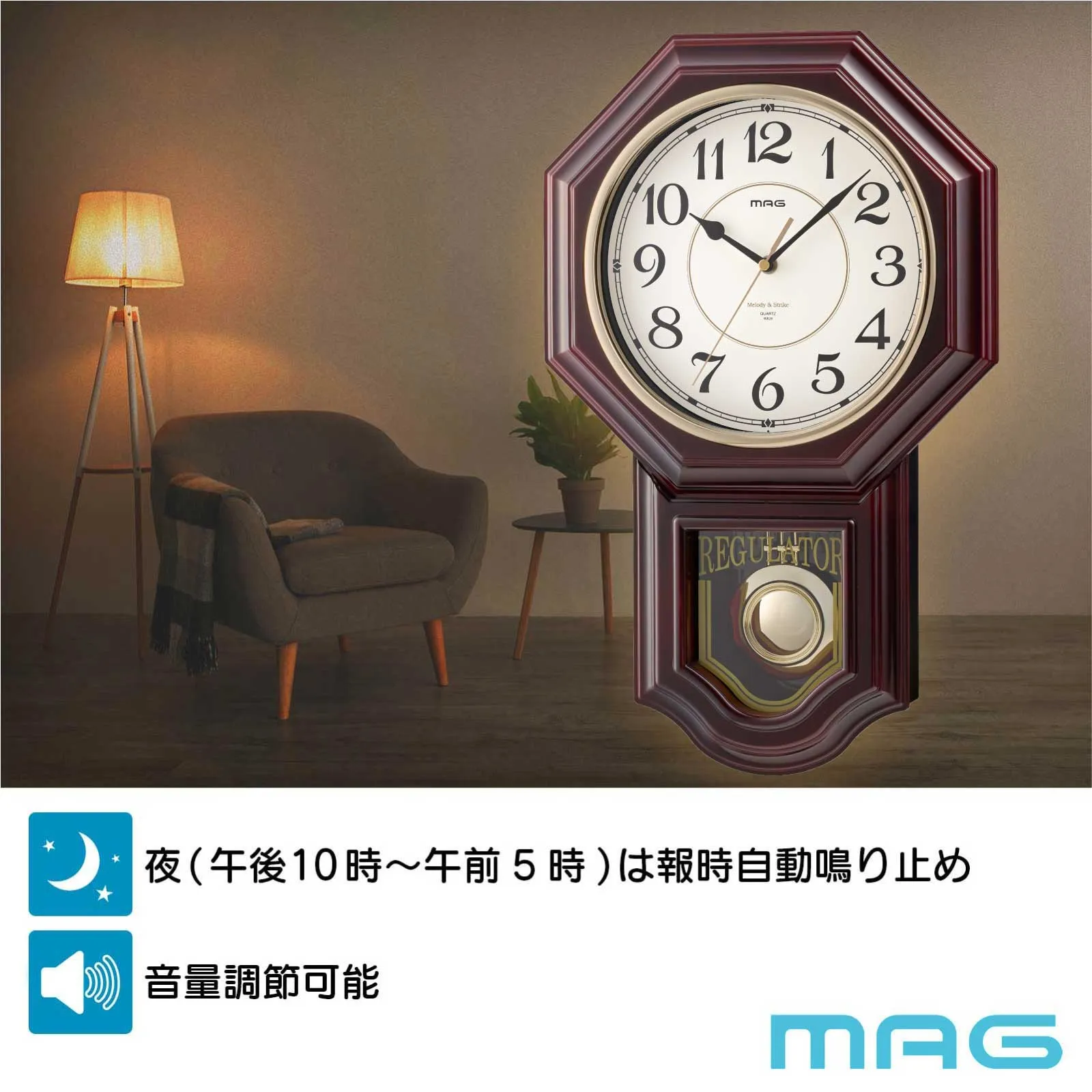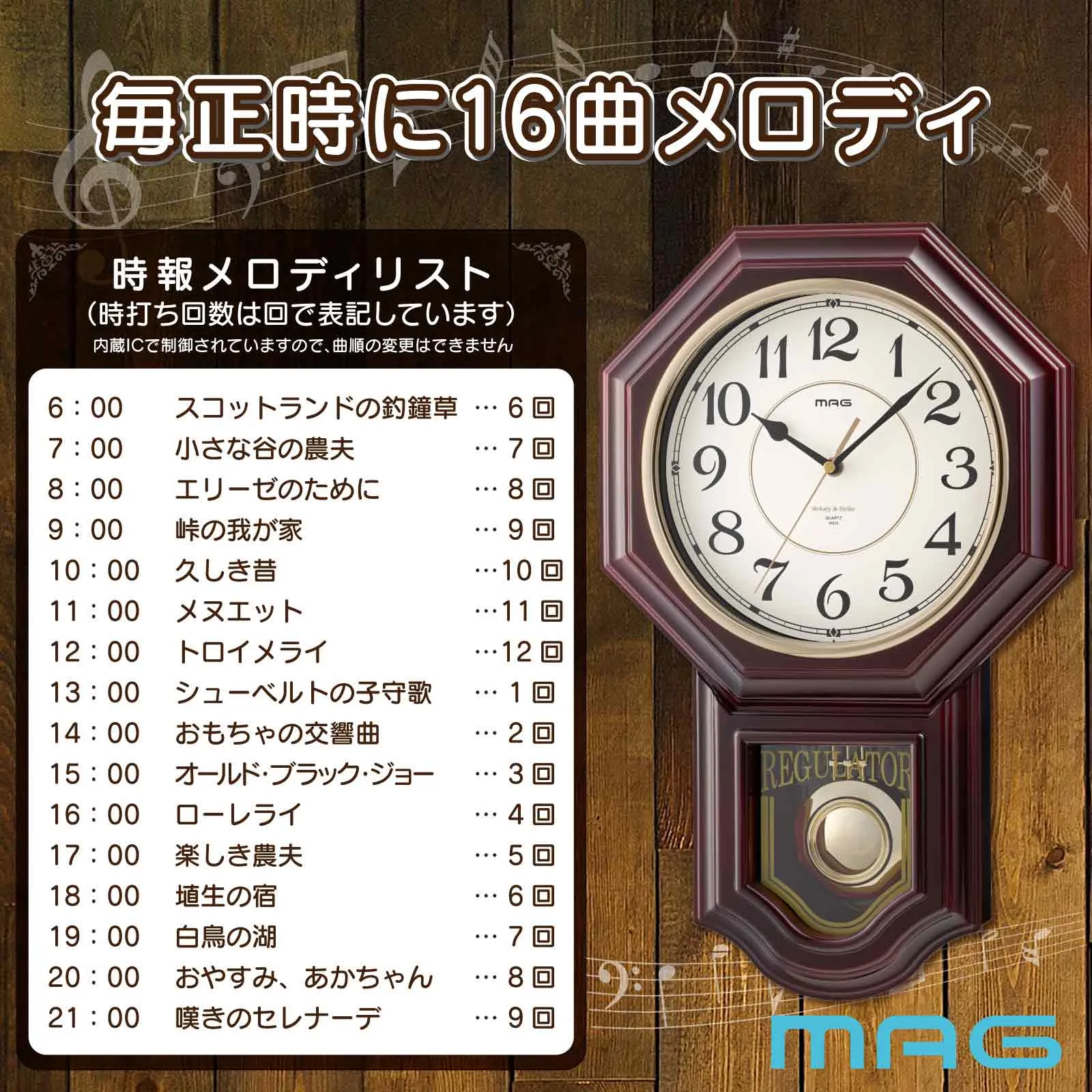 毎正時の16曲メロディ&ボンボン時打ち機能。夜間(PM22時~AM5時)は自動で音が止まります。音量は背面ツマミで無段階調整可能。秒針は滑らかに動きます。