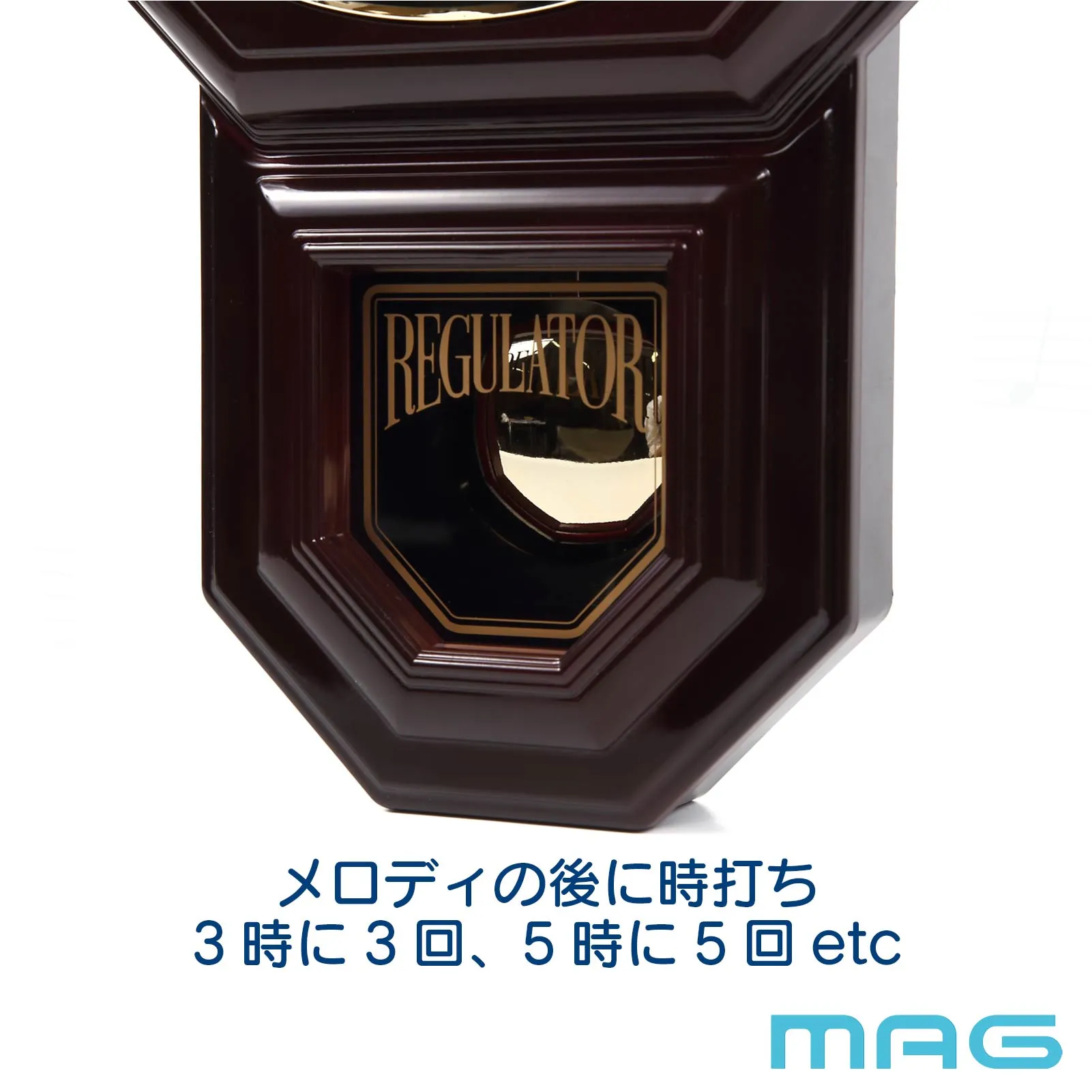 連続秒針、振子、報時(メロディと時打ち)、音量切替、報時自動鳴り止め