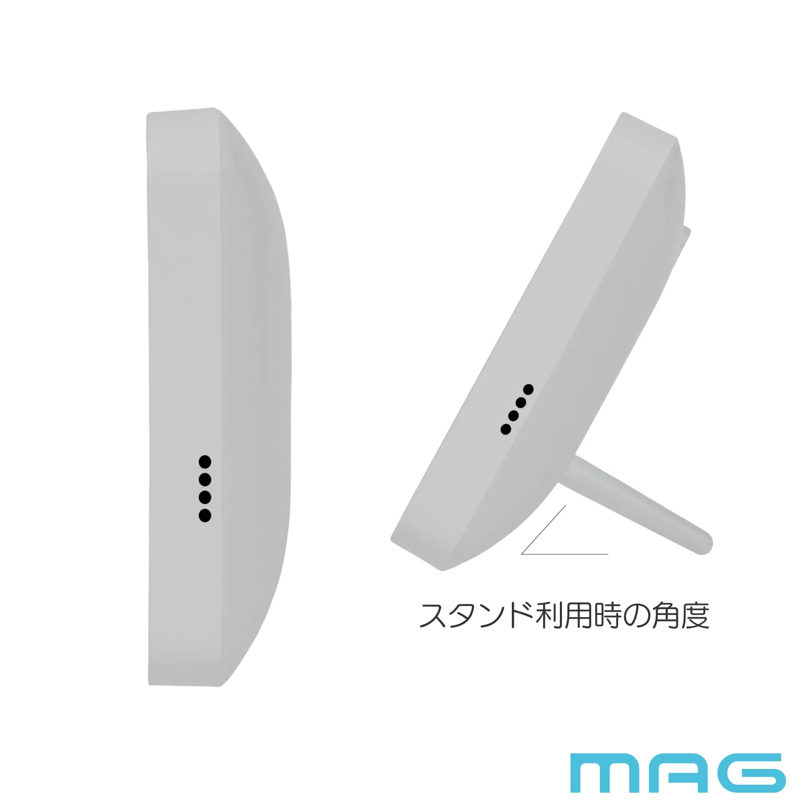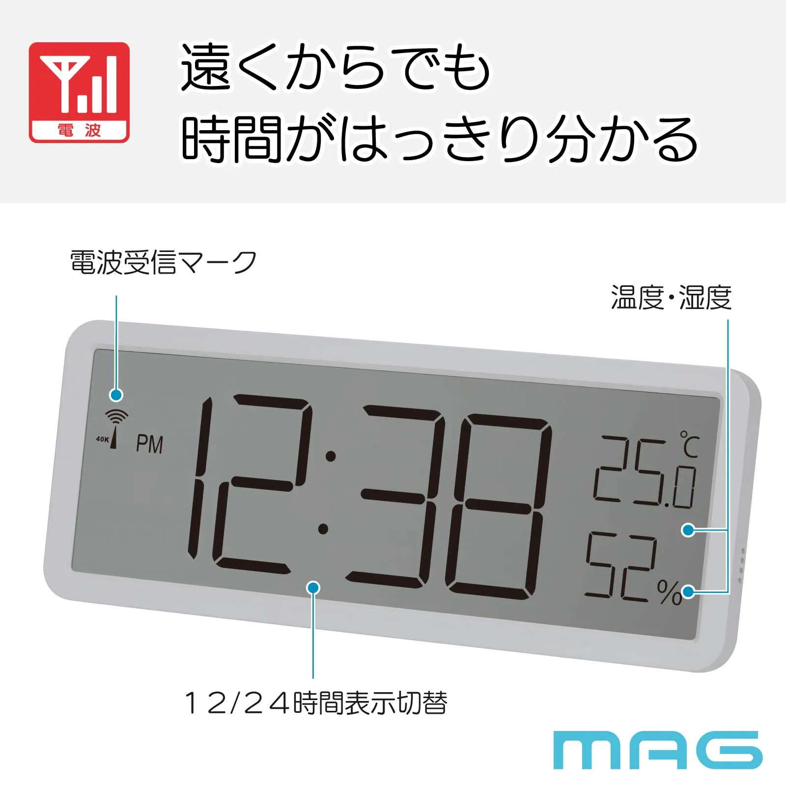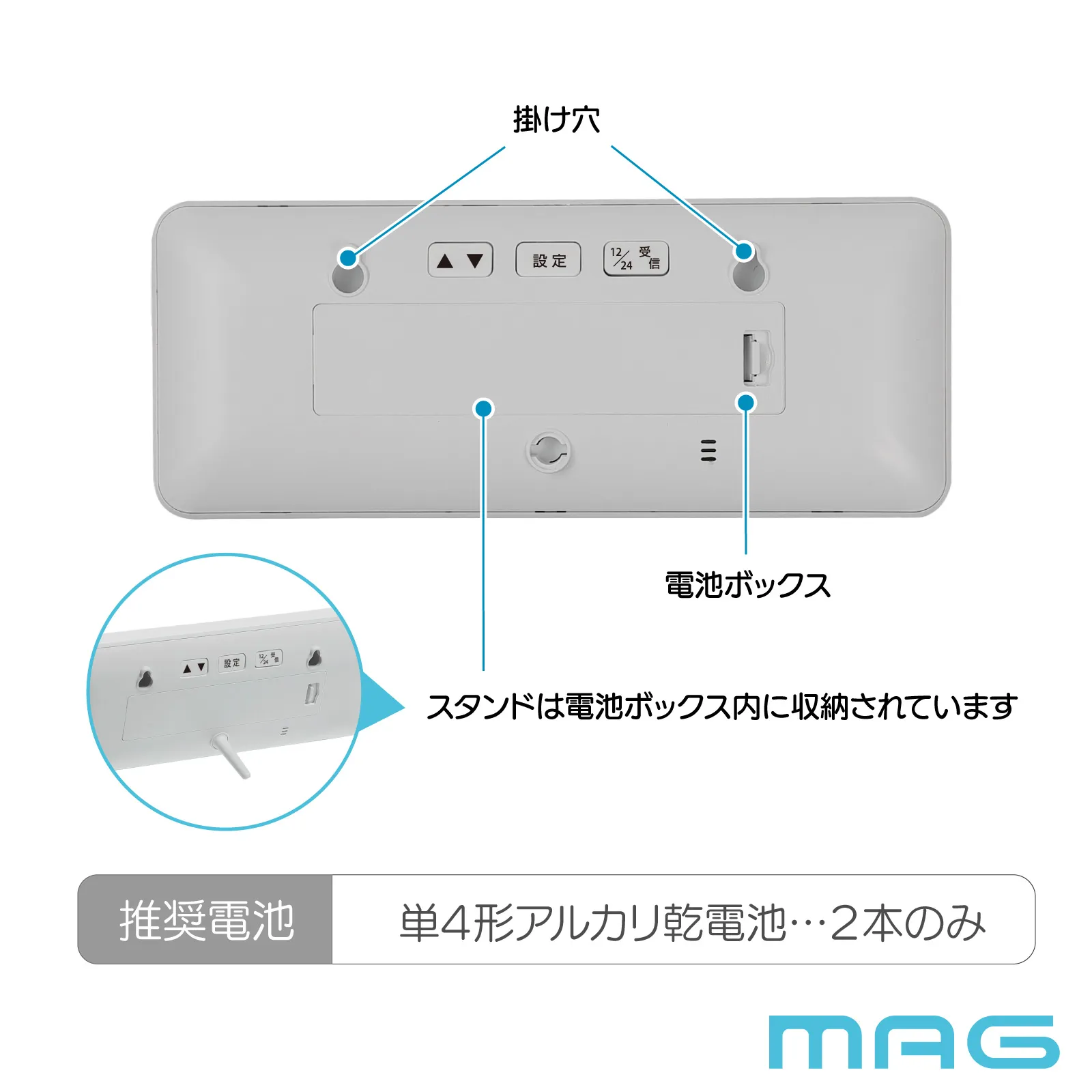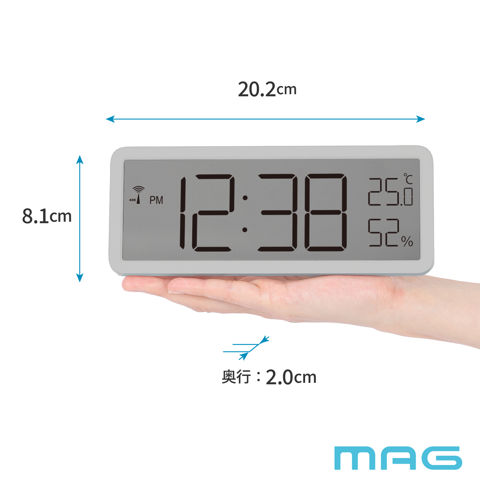 シンプルで分かりやすく見やすい表示のデジタル電波時計。オシャレな細めの数字フォント。温度・湿度・電波受信マーク付き。場所にあわせて置いたり掛けたりできる両用タイプ。