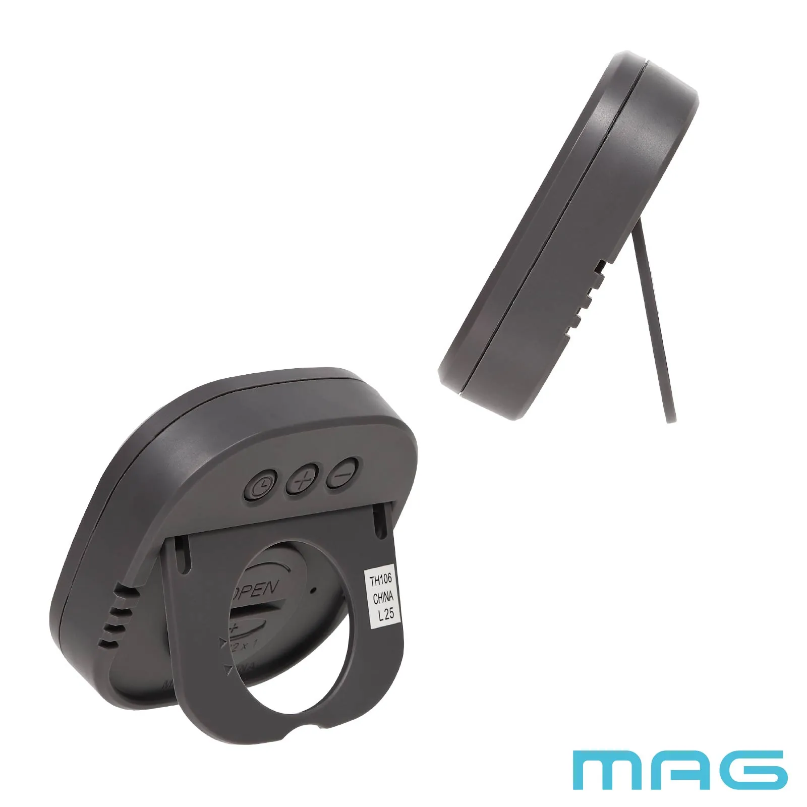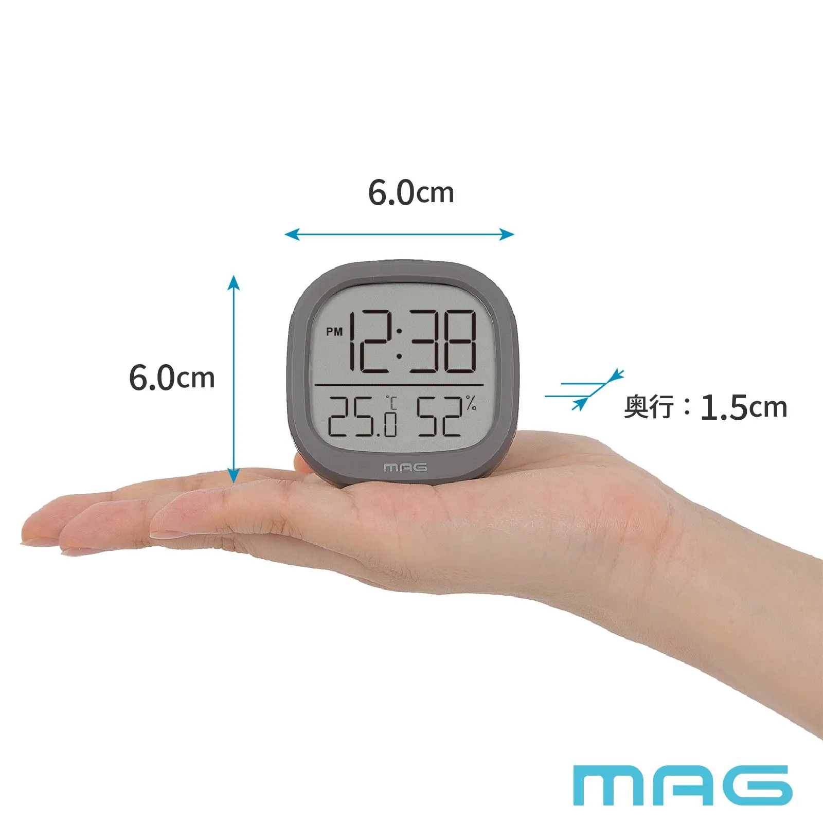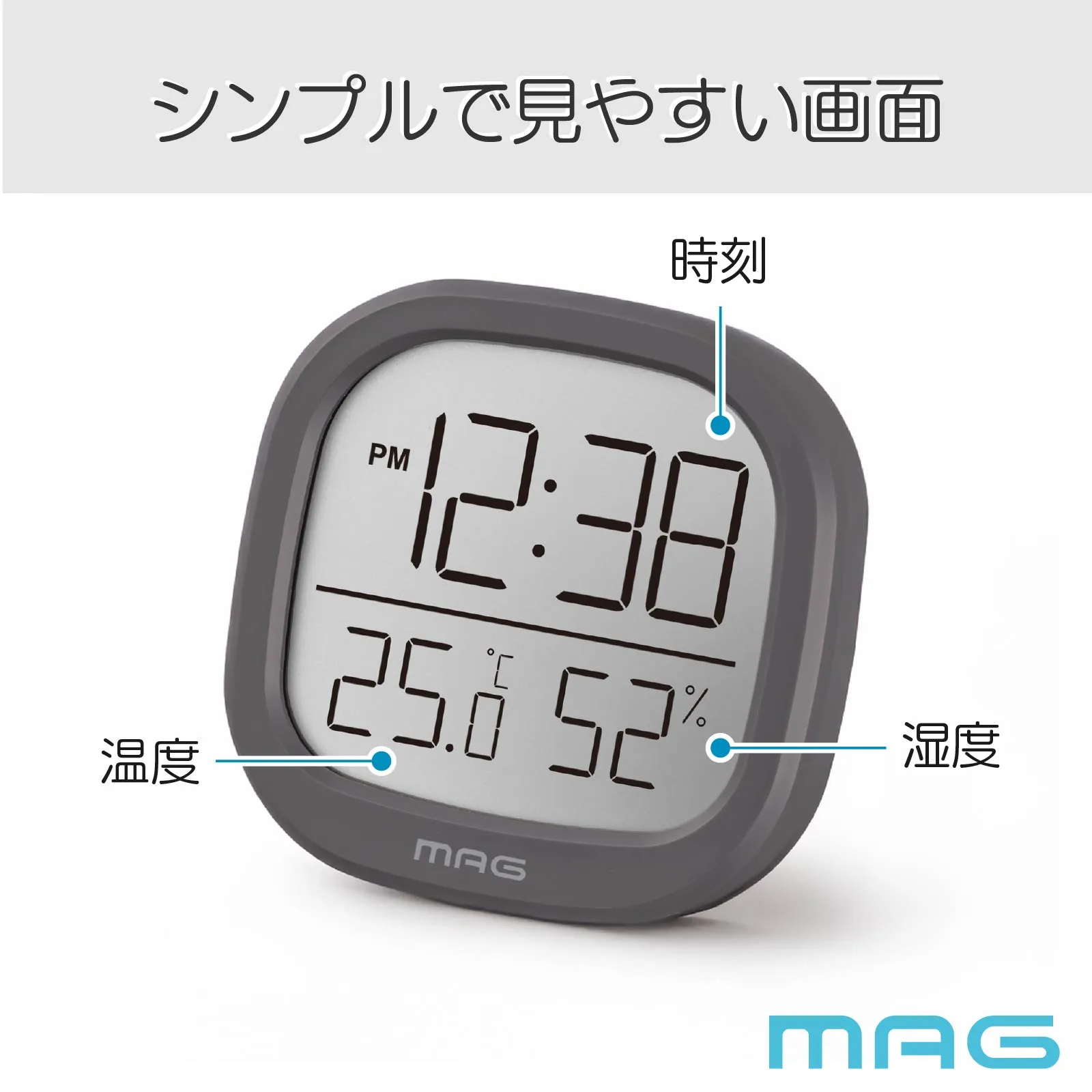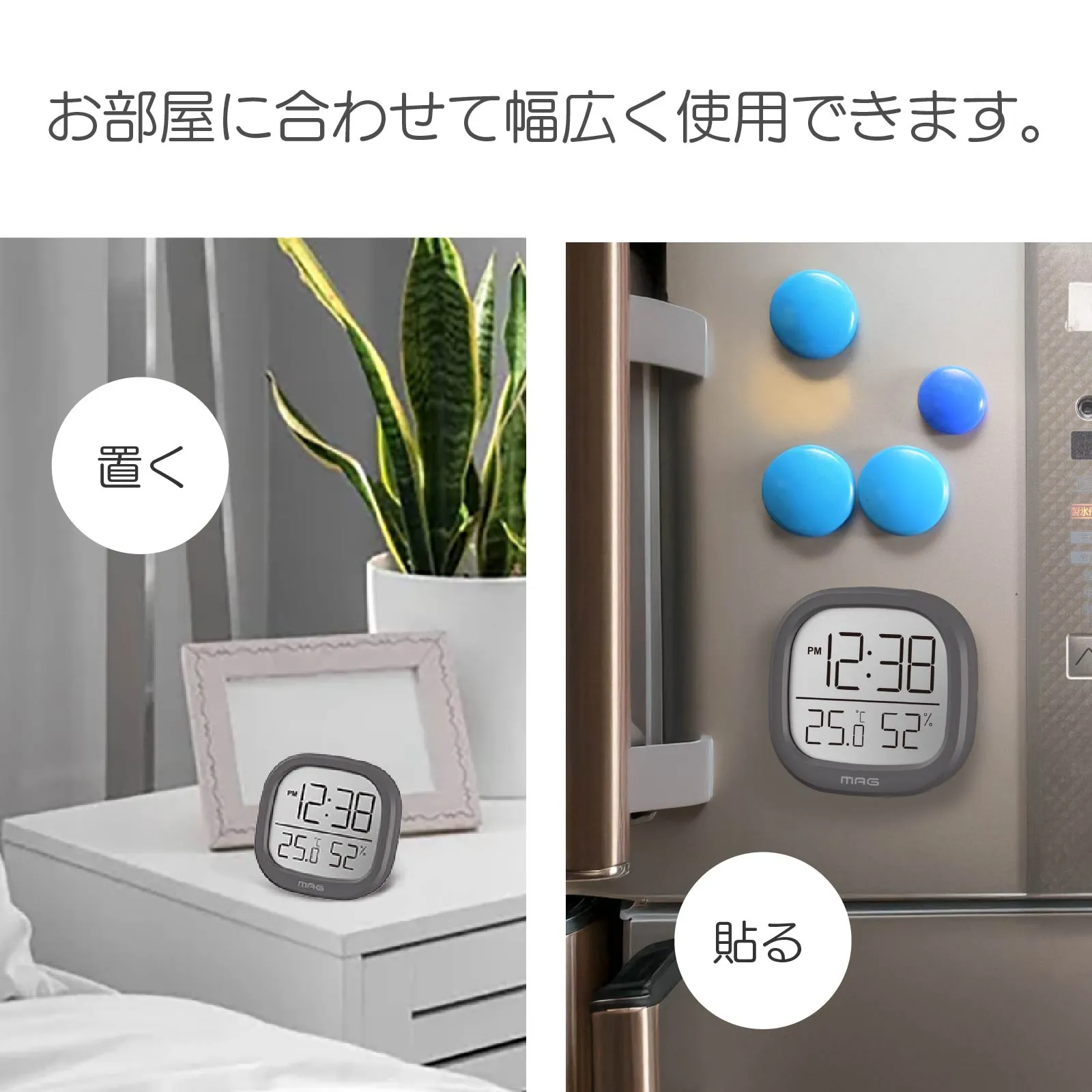 快適な空間づくりをサポートする温度湿度計。少し細目の数字フォントがインテリアにマッチします。時刻表示、電池交換時期をお知らせするアイコン付き。置いても掛けても使用できるため設置場所に困りません。使い勝手のよいシンプルな温湿度計です。
