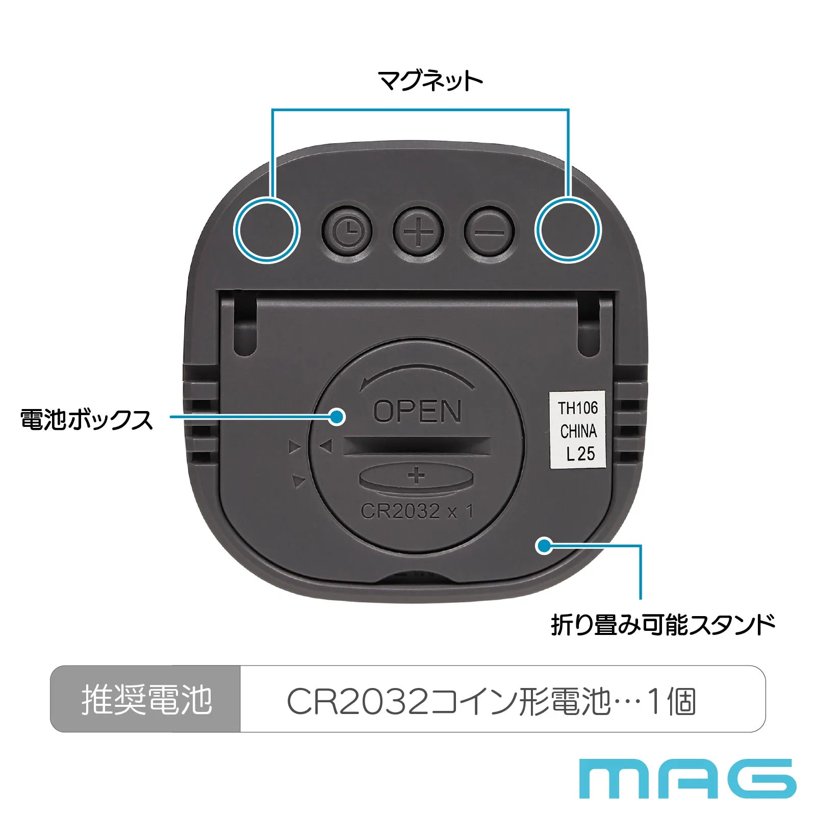 時刻表示、温度/湿度表示、12/24時間表示切替、電池交換お知らせ表示、置掛兼用、フック陳列対応型パッケージ